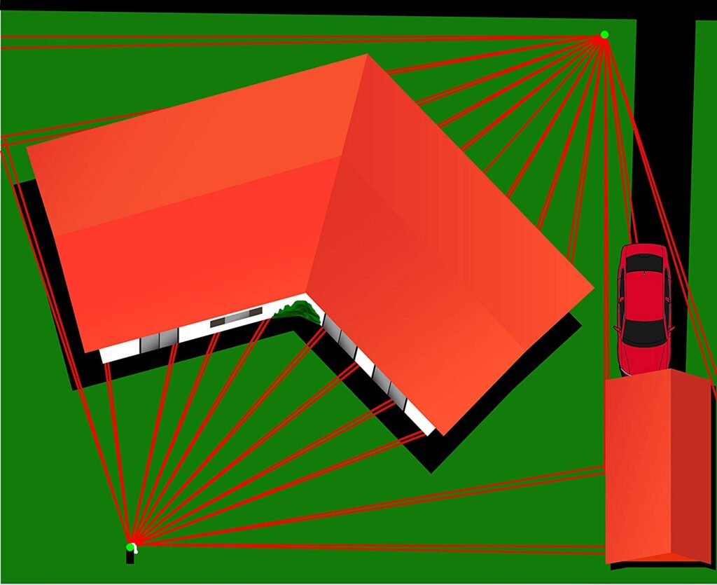 Roboguard uses two passive infrared sensors that fan out to cover an area of 110° at a radius of 20 meters. This equates to 2 X 11 beams, one every 10 degrees that will cover an area of 400 square meters.