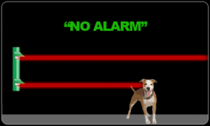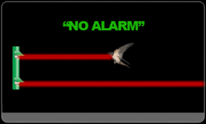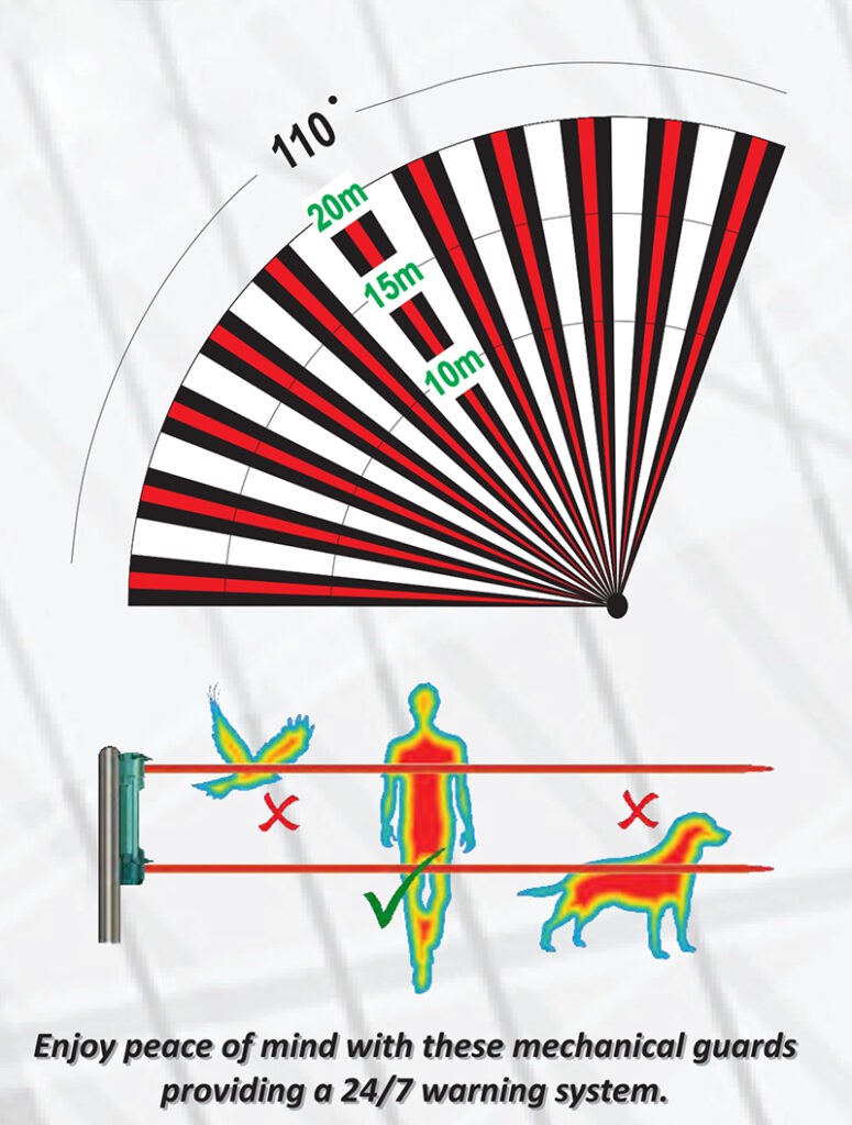 Roboguard uses two passive infrared sensors that will pick up any heat movement and determine whether it is a human. In order to trigger a Roboguard you have to break both the top and bottom beam, which minimises false alarms to almost zero. There is an array of 11 beams covering an area of 110° at a radius of 20 meters.